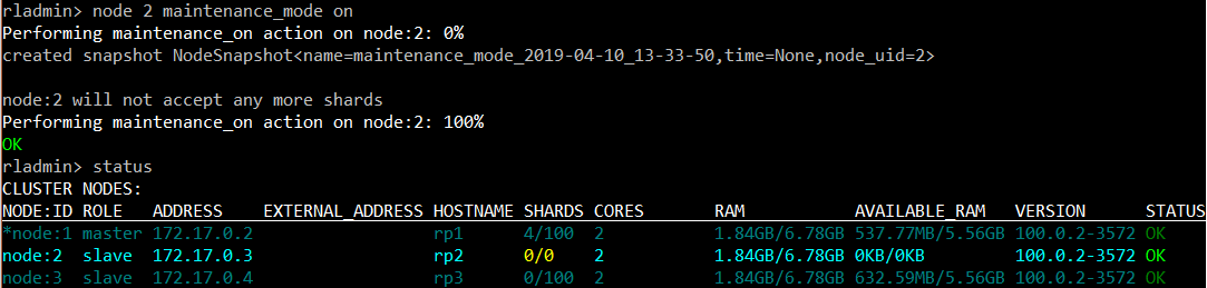 redislabs@rp1_node1:/opt$ rladmin node 2 maintenance_mode on