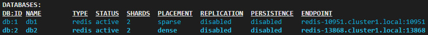 dense- Place as many shards as possible on the smallest number of nodes to reduce the latency between the proxy and the database shards; Recommended for Redis on RAM databases to optimize memory resourcessparse- Spread the shards across as many nodes in the cluster as possible to spread the traffic across cluster nodes; Recommended for databases with Auto Tiering enabled to optimize disk resources