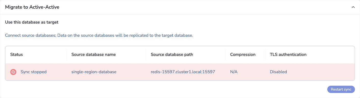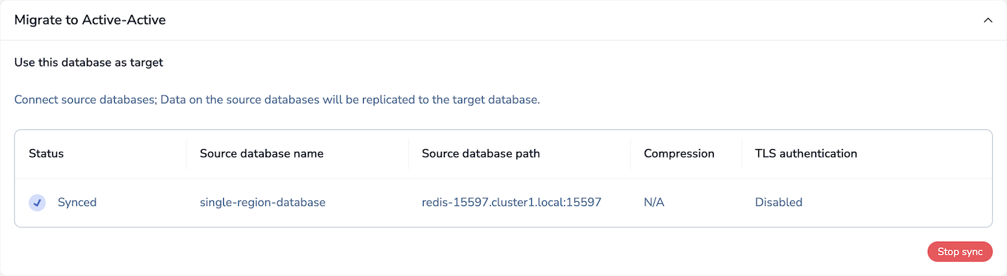 Redirect client connections to the Active-Active database after Status changes to Sync stopped: