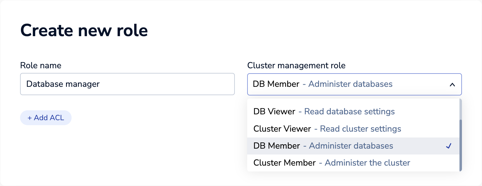 Create a role with ACLs added and choose a Cluster management role other than None.