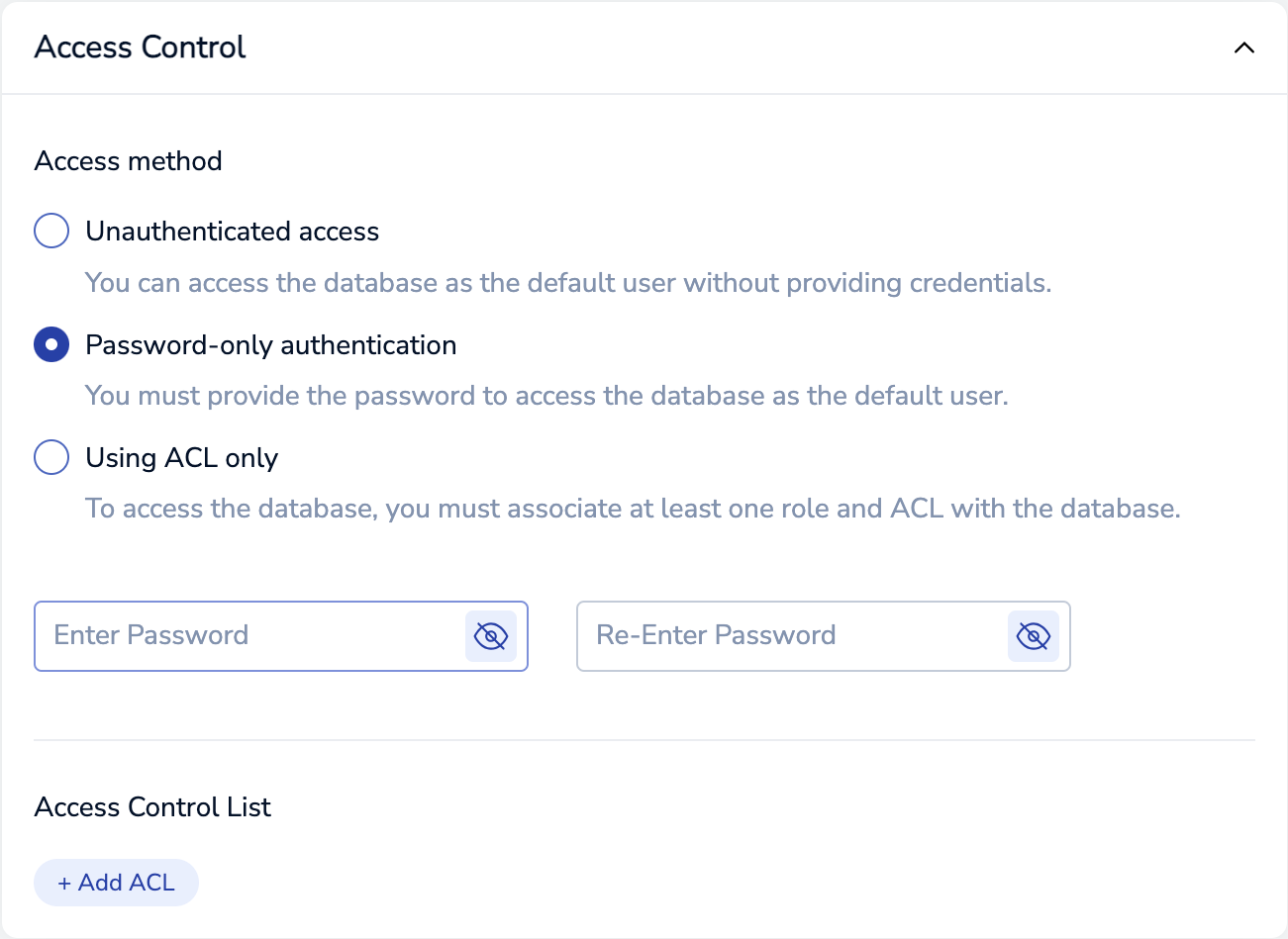 When you create a database, default user database access is enabled by default (Unauthenticated access is selected). This gives the default user full access to the database and enables compatibility with versions of Redis before Redis 6.
