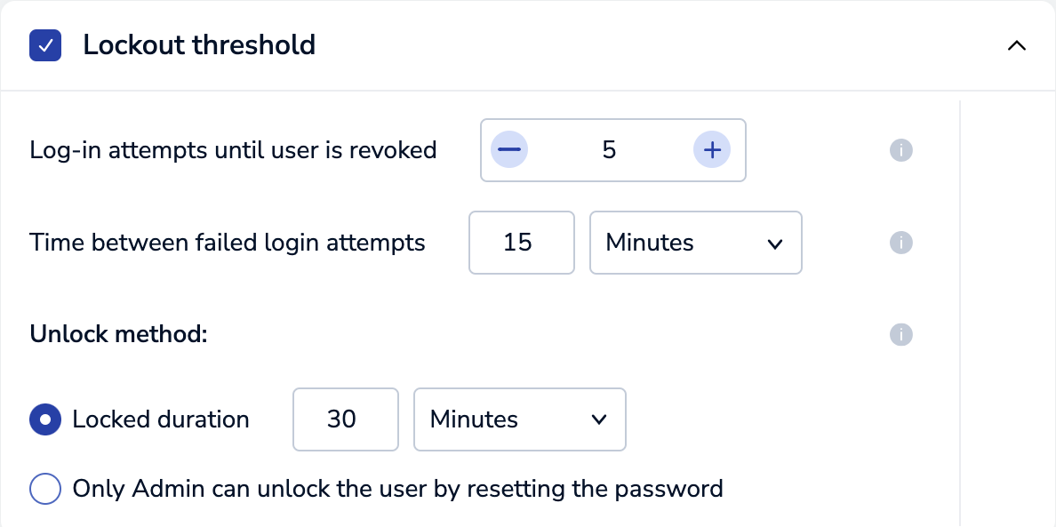 Locked duration to set how long the user account is locked after excessive failed login attempts.