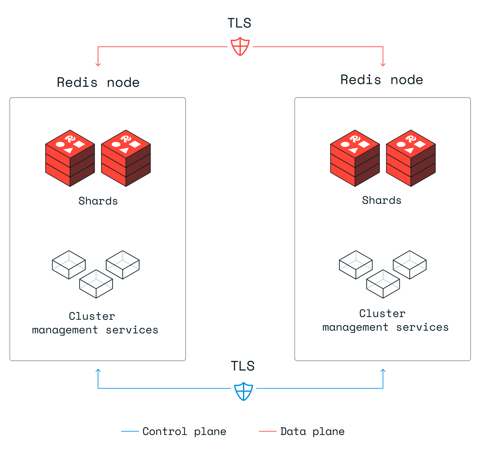 As of v6.2.4, Redis Enterprise Software supports internode encryption, which encrypts internal communication between nodes. This improves the security of data as it travels within a cluster.