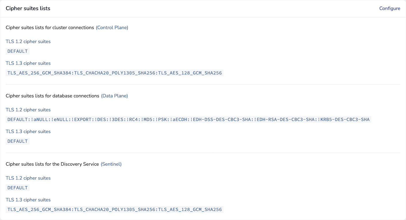 | data_cipher_suites_tls_1_3 | ✅ Yes | Cipher list for TLS 1.3 communications between applications and databases (data plane) |
